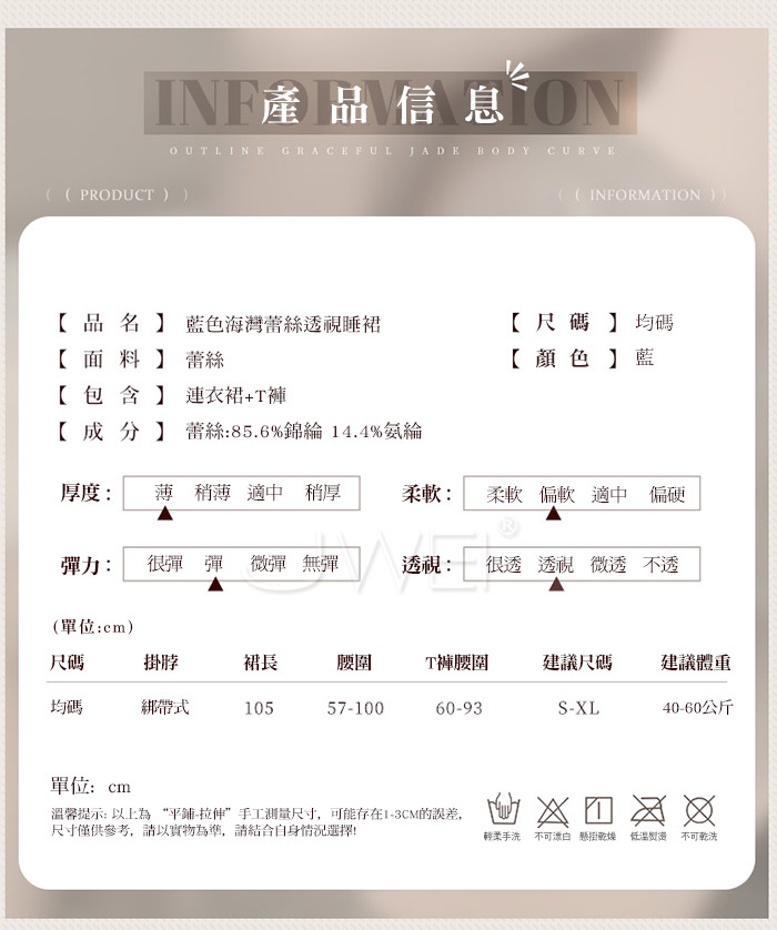 ■內容物:連衣裙+T褲 ■適穿尺寸:FREESIZE ■彈性:彈 ■未撐開平量尺寸正負誤差1~2cm,1吋=2.54cm ■注意事項:基於保障消費者個人衛生,此貼身衣物恕不接受退換貨。 (如為商品本身暇疵,接受七日內換貨,請勿試穿,謝謝您)