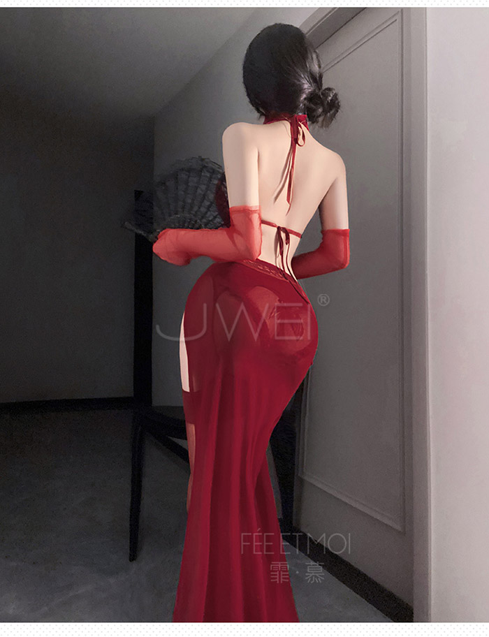 雙色嬌妻.迷迭花樣掛脖頸環美背側高衩網紗睡裙-紅【頸環+連身裙+內褲】