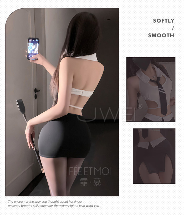 ►您現在的位置:首頁>OL領域.挖空露腰美背撞色雙開衩包臀裙OL小秘制服套裝【上衣+領帶+包臀裙+內褲】