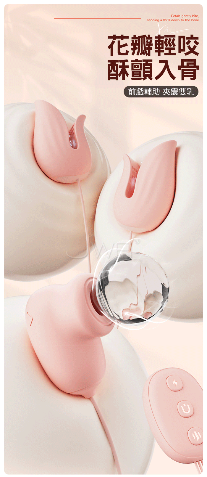 花瓣輕咬 酥顫入骨,前戲輔助 夾震雙乳,鬱金香花瓣 造型儀式感 微電流穿梭刺激,3速7頻10重維度,花式玩法不單調,柔軟矽膠材質 緊緻貼合 酥麻刺激,按摩凸點設計 刺激更進一步,感官統治 ■尺寸:大小詳如圖片標示 ■材質:矽膠+ABS ■功能:10頻電擊+震動