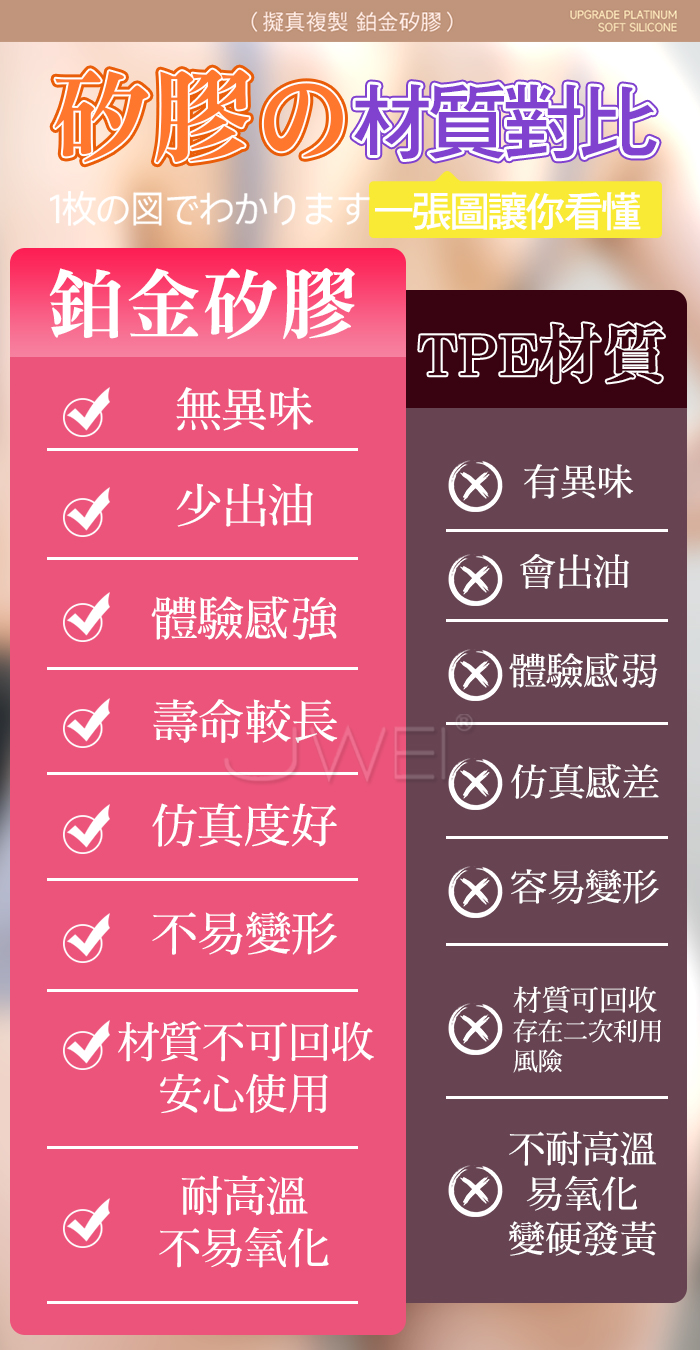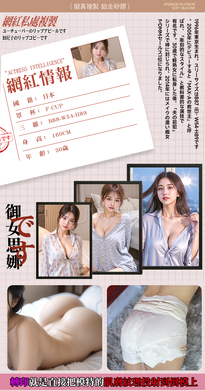 擬真觸感 蝴蝶外形,轉印私處 追求不同體驗 柔軟溫婉如玉,曲線身材,觸感柔軟有彈性,柔軟度擬真般觸感 大陰唇爆滿有肉,紋理清晰,任意姿勢隨意把玩~ 產品規格 ■尺寸:大小詳如圖片標示 ■材質:TPE ■特點:雙通道