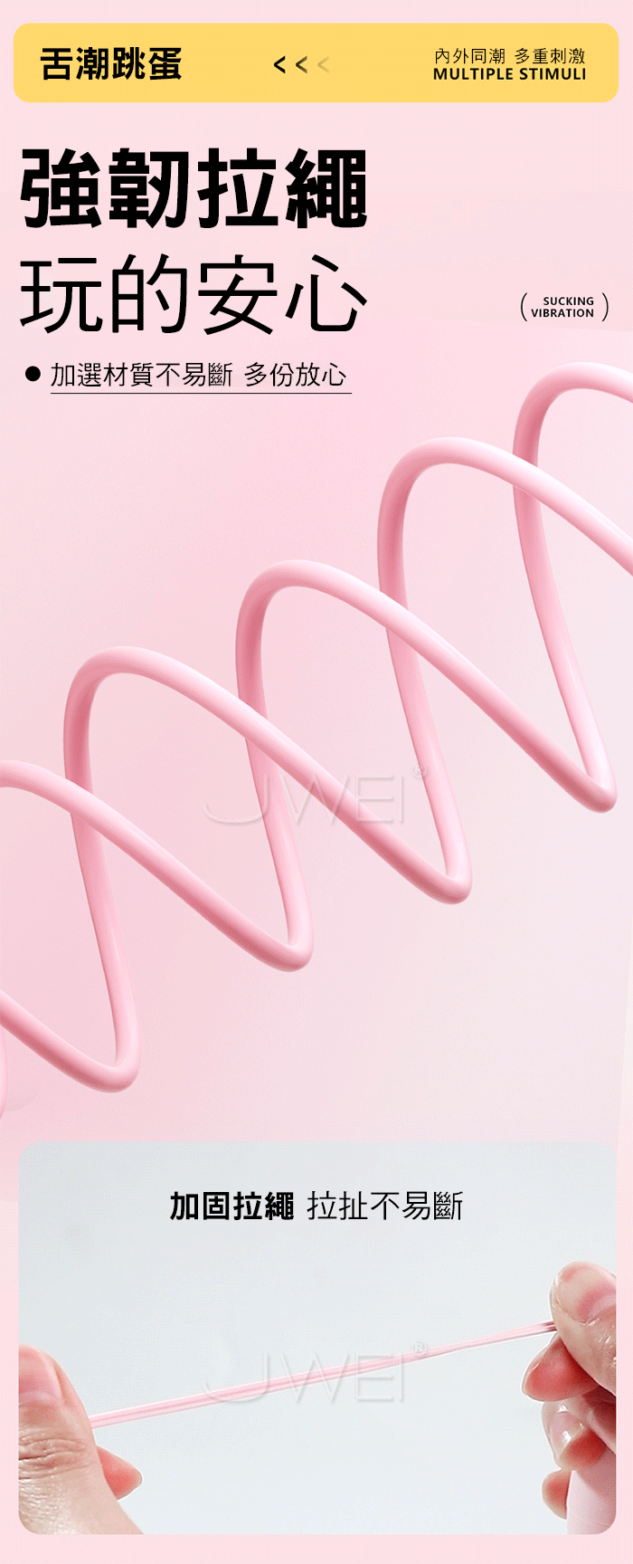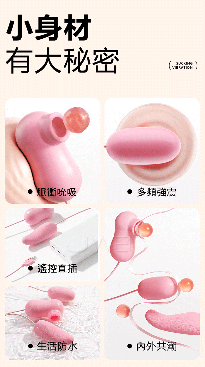 舌潮跳蛋 吸震一體,內外共潮 多點刺激,1+1>2的快樂 綿柔吮吸 動感裹吸,軟糯小嘴 緊緊包裹蜜豆,嘬吸C點 喚醒敏感神經 10頻強震,深入密道探索,多重頻率強震圍攻G點,花樣潮玩 震的狠 多面刺激 強韌拉繩 玩的安心,加選材質不易斷 多份放心,USB直插 方便快捷 強勁續航! 產品規格 ■材質: 矽膠+ABS ■規格: 詳如圖片標示 ■功能: 10頻吮吸、10頻強震、USB直插