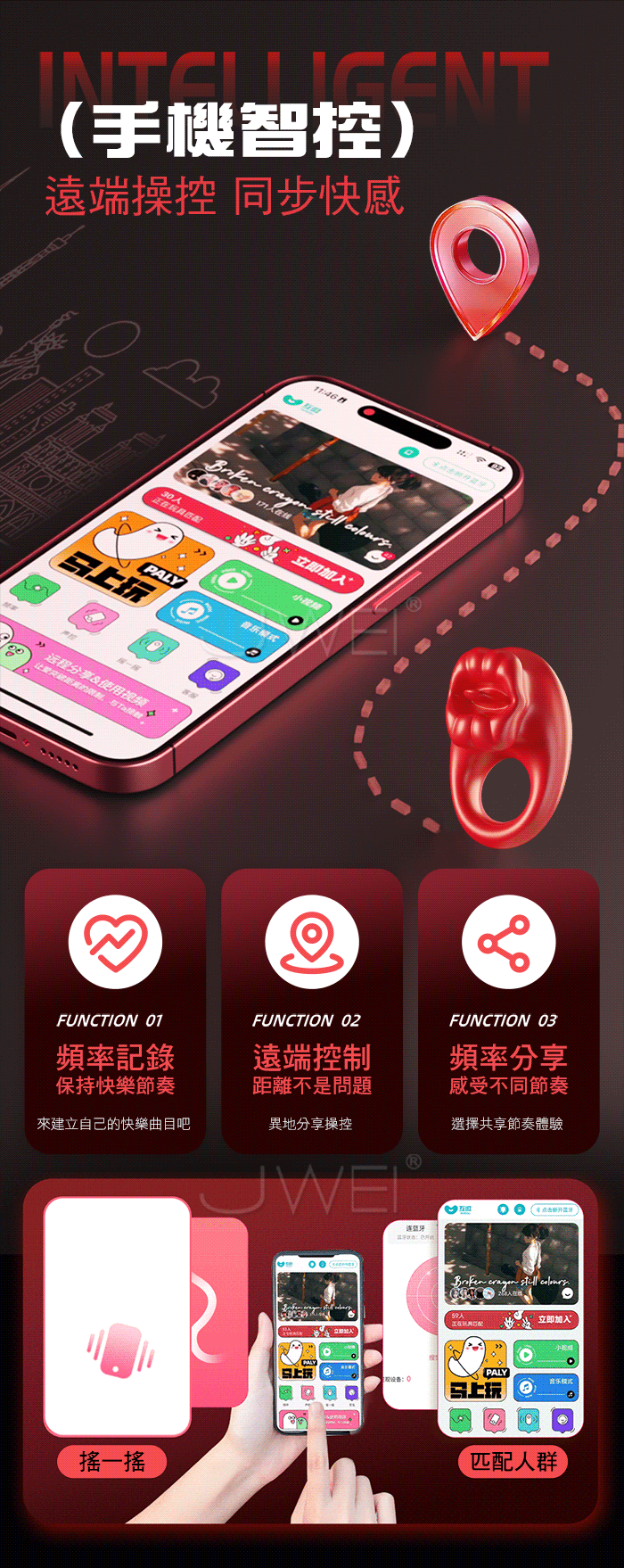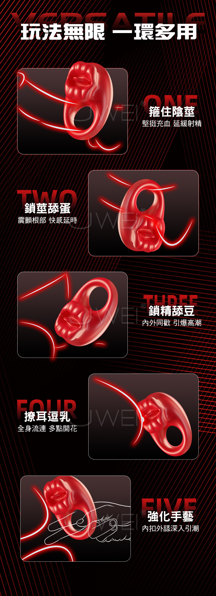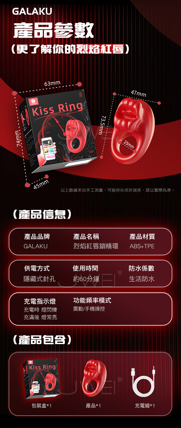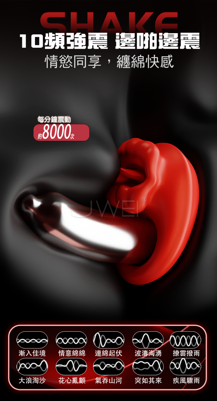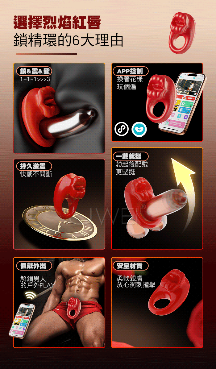 男人更持久/女人更快樂,秒變猛男の「作弊」神器,烈焰紅唇鎖精環 物理鎖精+強震舔豆,雙效加持,助力高品質性愛 10頻強震 邊啪邊震,情慾同享,纏綿快感,每分鐘震動約8000次 手機APP遙控,遠端操控 同步快感,真愛0距離! 產品規格 ■材質: 矽膠+ABS ■規格: 詳如圖片標示 ■功能: 10頻震動、APP智控