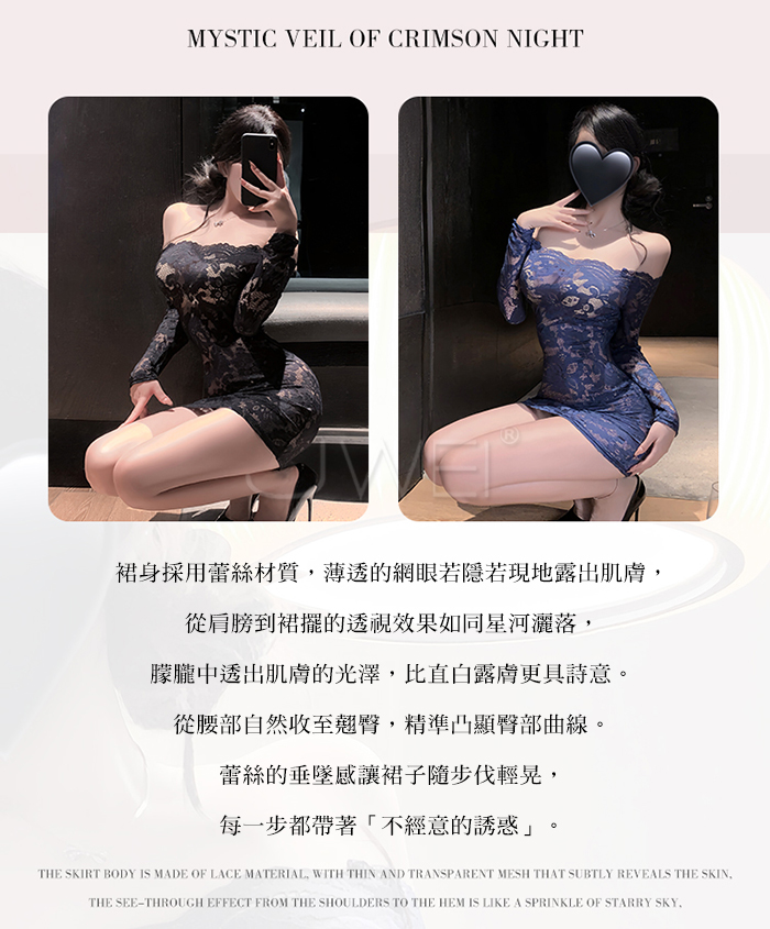 | 花蔓朦朧.蕾絲雕花一字領透視包臀睡裙【連身裙+T褲+隱形肩帶-黑色】