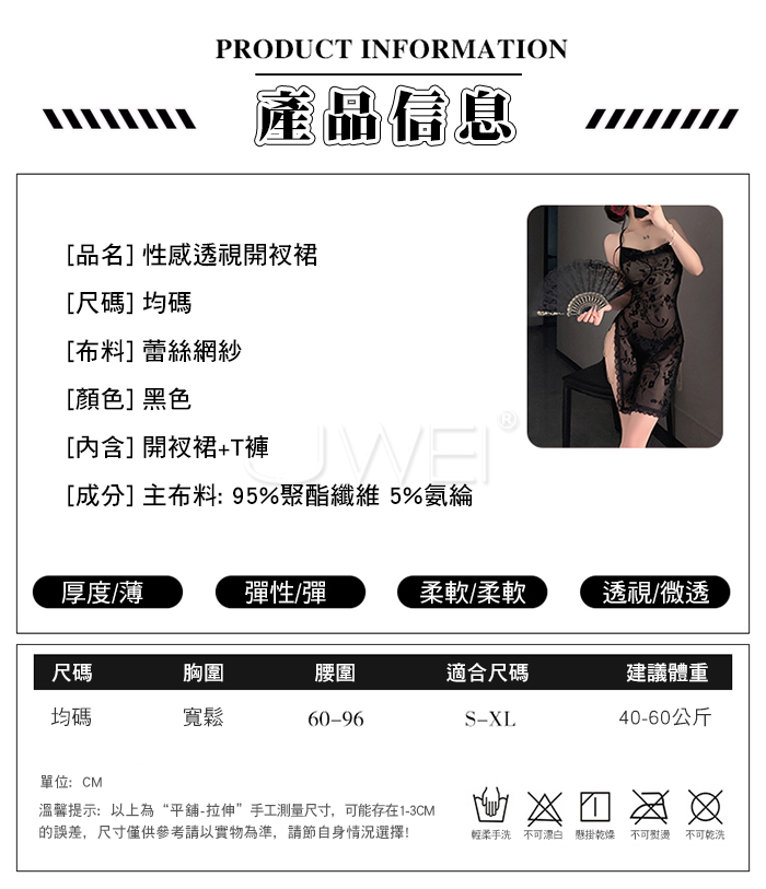 ■內容物:開衩裙+T褲 ■適穿尺寸:FREESIZE ■彈性:彈 ■未撐開平量尺寸正負誤差1~2cm,1吋=2.54cm ■注意事項:基於保障消費者個人衛生,此貼身衣物恕不接受退換貨。 (如為商品本身暇疵,接受七日內換貨,請勿試穿,謝謝您)