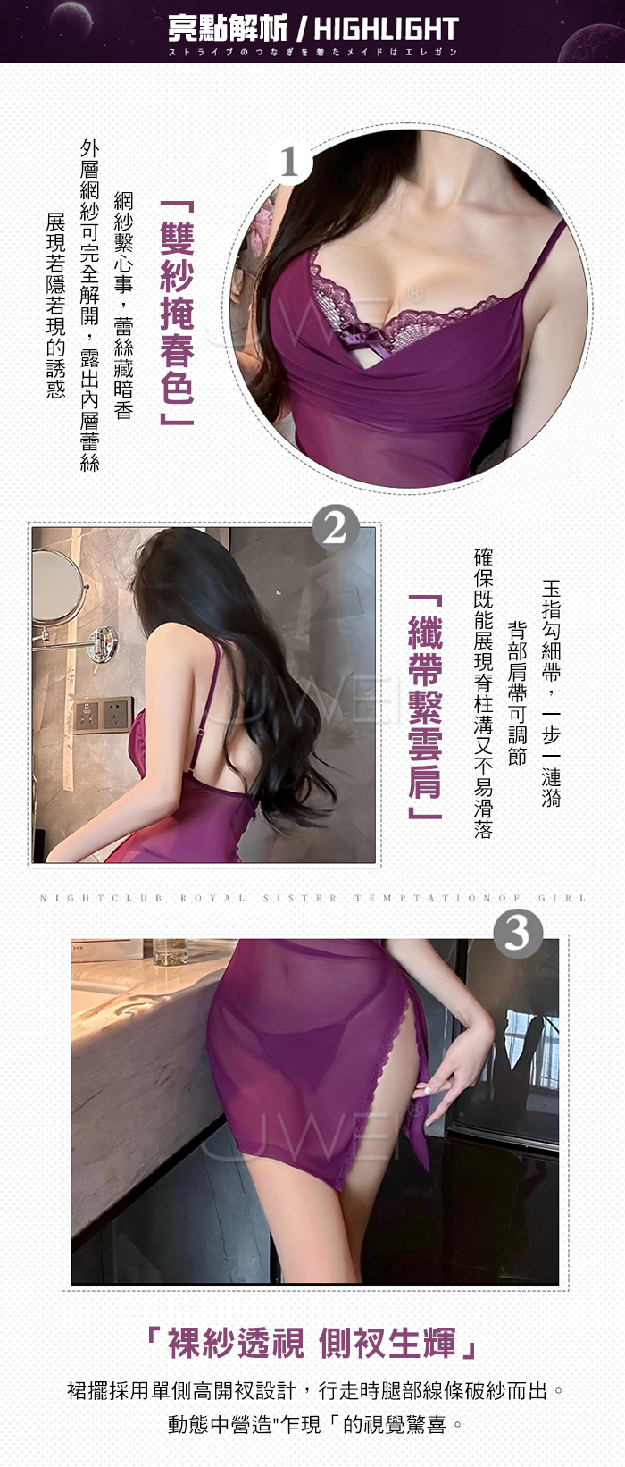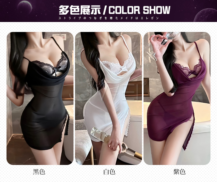 | 月暮迷紗.性感裸紗蕩領透視側開衩細肩帶美背睡裙【睡裙+T褲-黑色】