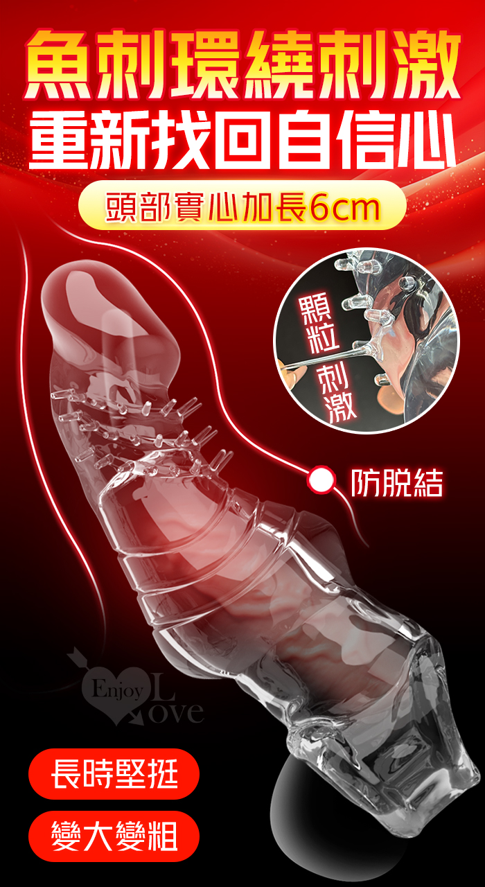 ►您現在的位置:首頁>取悅 ‧ 鱼刺套 顆粒刺激~長時堅挺~前端實心變粗變大加強套﹝增長6公分+凸粗+束精+套蛋﹞