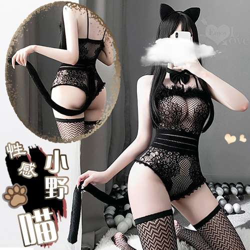 《 Enjoy Love 》極性貓裝!V領挖空爆乳緹花設計露肚開襠連身網衣