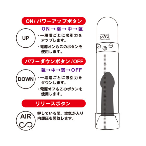 ご注意いただきたいのは電源を切っても吸引効果は続いていると言う事。 これ以上は吸われるのが辛い、すぐに止めたいと言うときは『AIR』を押すのが一番安全です。 強さの調節様子を見ながらご自身のペニスに過度の負担を与えないよう、 無理の無い範囲でお使い下さい。