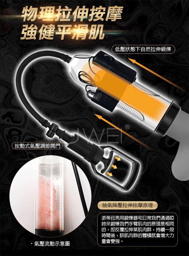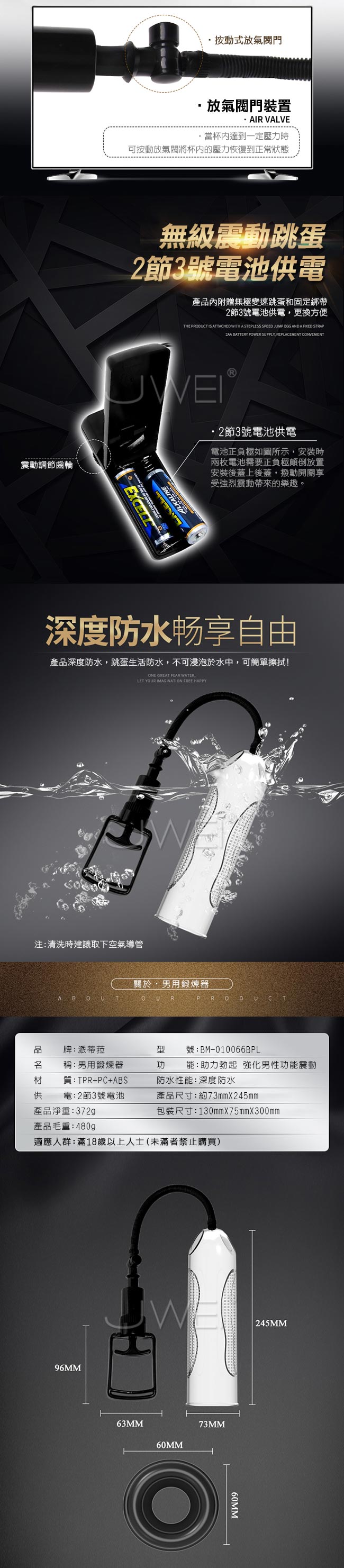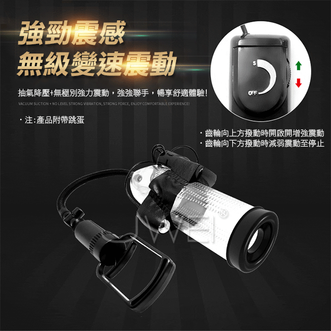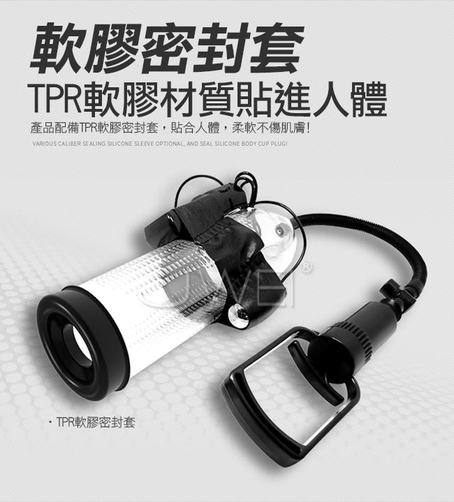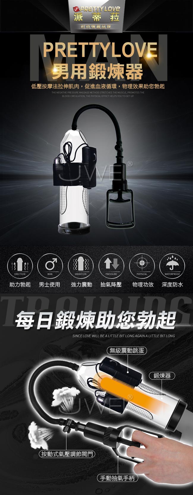 男用鍛煉器運用低壓按摩拉伸肌肉,促進血液循環,物理效果助您勃起。每日鍛煉強健平滑肌,反覆伸拉某肌肉群持續一段時間後,該肌肉群體積就會增大力量變強。採用降壓吸附拉伸肌肉擴大海綿體,增加肌肉血液循環運動以達勃起效果。用法簡單方便升壓及降壓完全由手動自由控制,讓鍛鍊器處於完全可控狀態,不會因為力量太大而不舒服,也不會因為力量太小而達不到效果。使用軟膠密封套TPR材質貼進人體柔軟不傷肌。搭配無級強力震動跳蛋,強強聯手,暢享舒適體驗!本產品深度防水設計,跳蛋生活防水不可浸泡水中,讓您享受自由性愛!