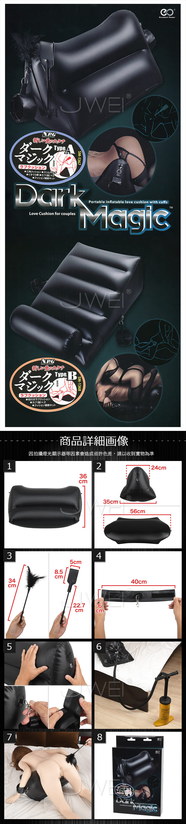 ■內容物:手銬x2、發癢棒x1、長鞭x1、氣墊x1