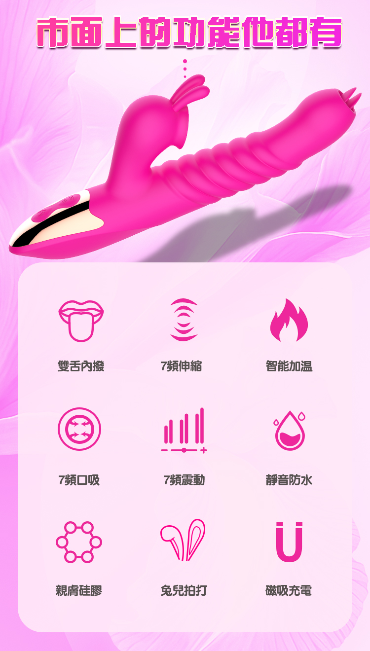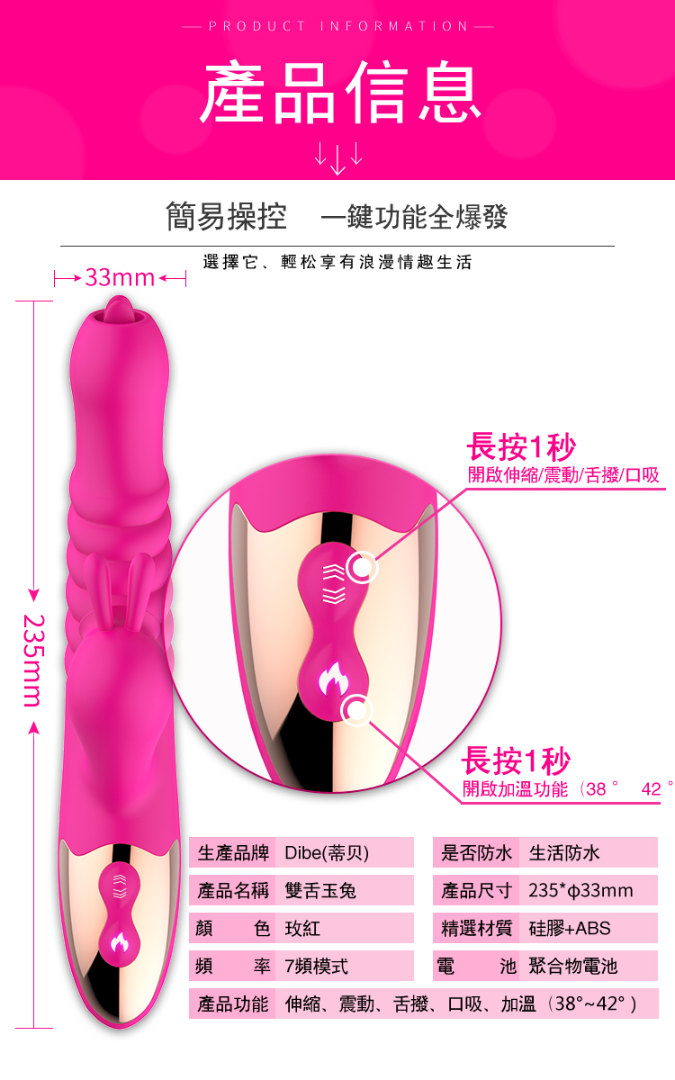 ►您現在的位置:首頁>Dibe-雙舌玉兔 狂抽送舔陰7段震動加溫矽膠按摩棒