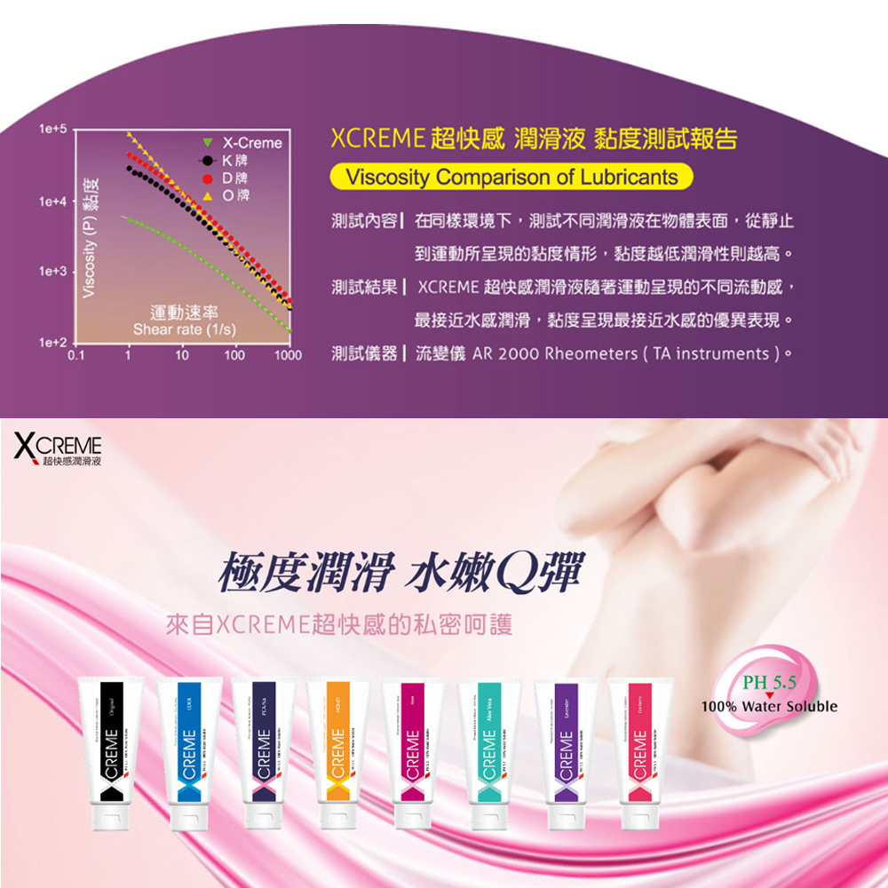 XCREME超快感潤滑液是專為兩性所設計,用以保持身體潤滑及增益兩性生活樂趣!台灣製造,水溶性配方,清洗方便不黏膩,色澤透明晶瑩,PH值5.5弱酸性,溫和不刺激皮膚,適合乾燥陰部肌膚,使用起來清新、自然、潤澤,是增添情趣及親密感的選擇!