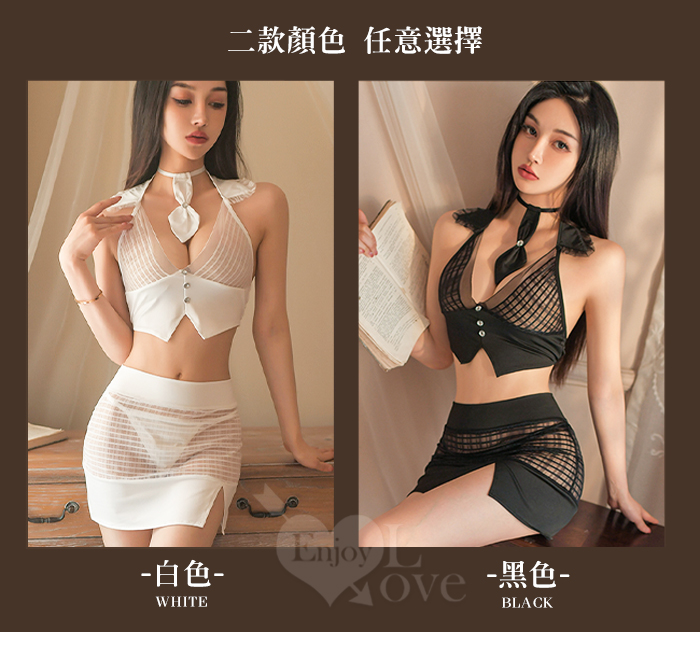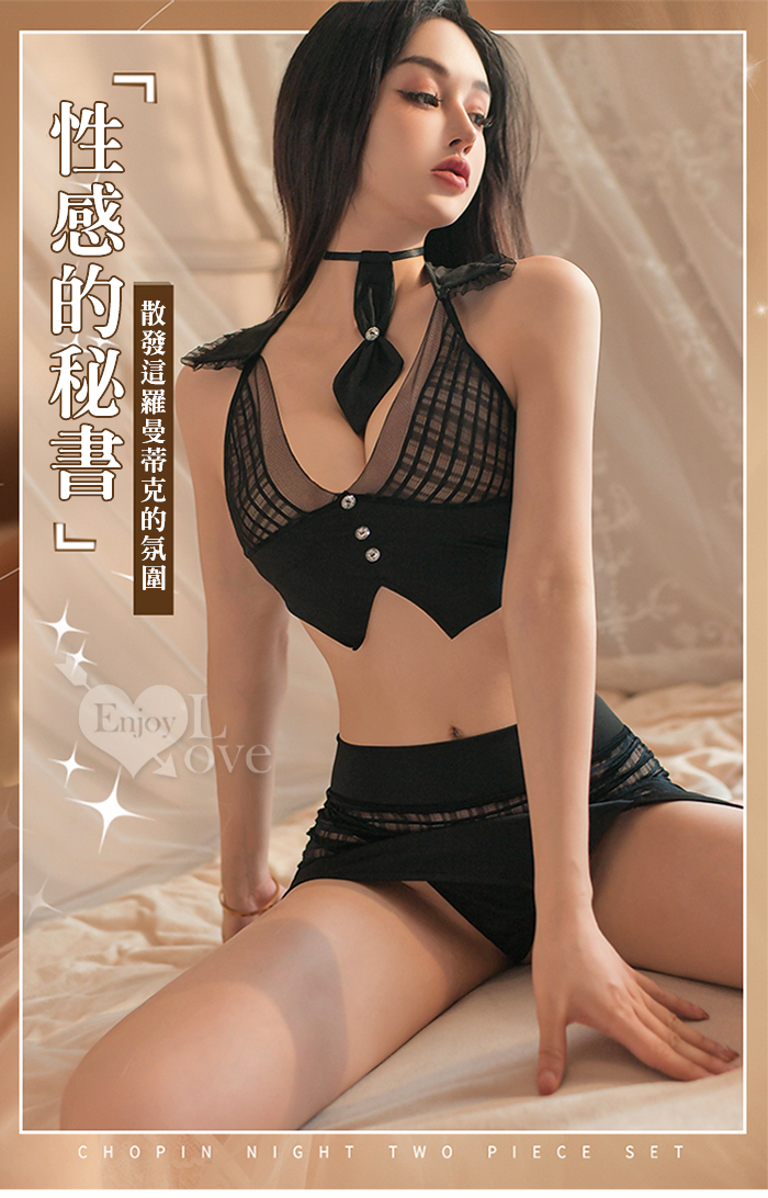 秘書角色扮演服!網紗V字格紋透視短裙四件式套裝﹝黑﹞
