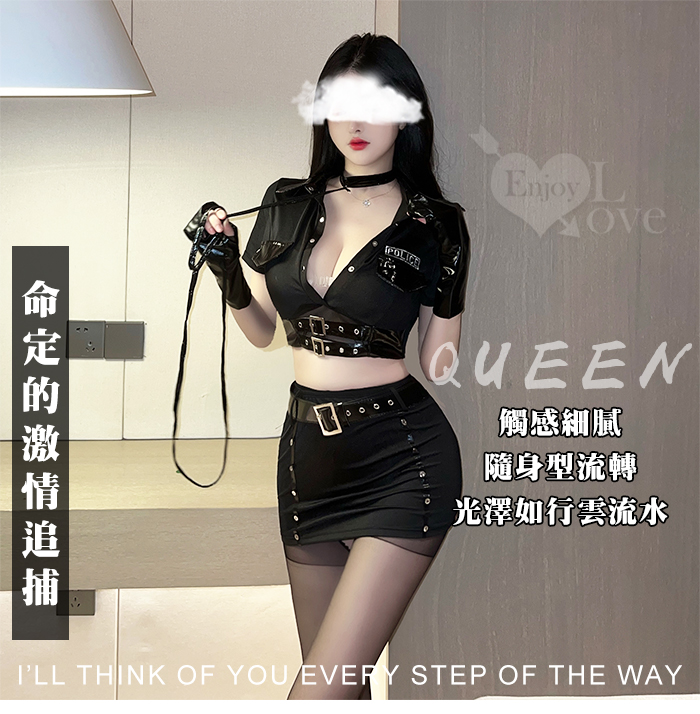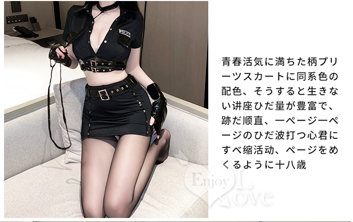 女警角色扮演服!帥氣翻領皮革點綴鉚釘釦開襠襪四件組