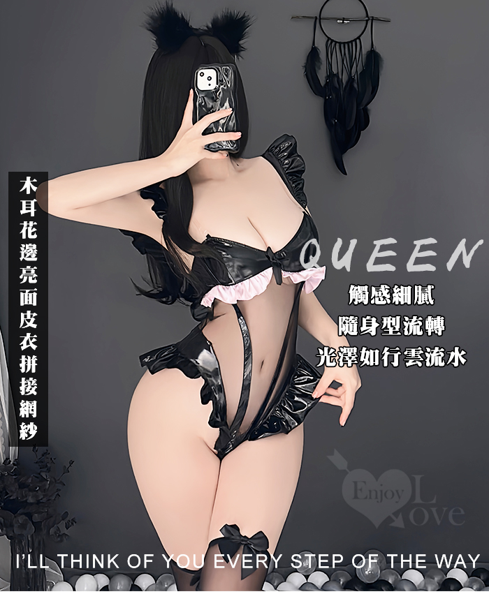 | 狂野連身衣!木耳花邊亮面皮衣拼接網紗透膚兩件組