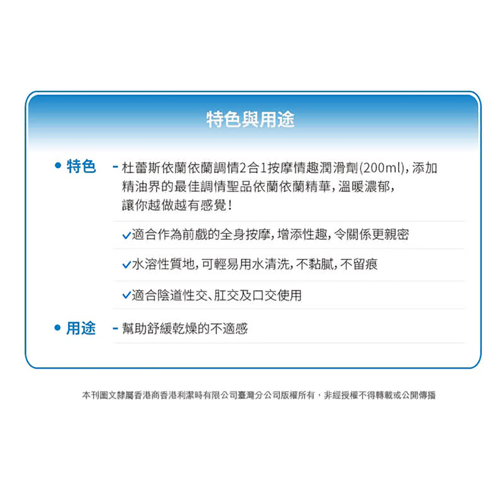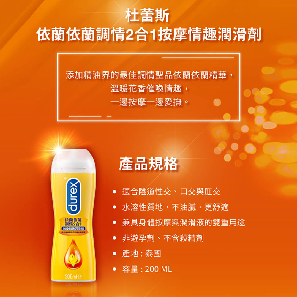 ►您現在的位置:首頁>Durex 杜蕾斯‧依蘭依蘭調情2合1按摩情趣潤滑劑200ml