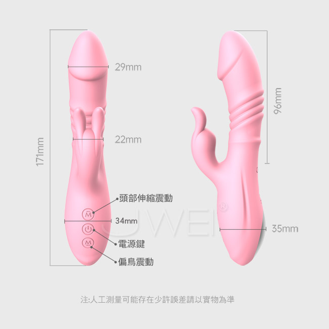 擁有它,掀起一場全新的性愛體驗,自適應伸縮,享受深入淺出的刺激,溫柔有度,每一秒都在享受;雙重刺激不止於雙倍快感,自動伸縮,多種抽插頻率,長距離伸縮入體濕滑摩擦內壁;前端震動,花樣酥麻震動,刺激C點更強勁;偏鳥震動,高頻輸出刺激豆豆,體驗多重快感,開啟更深層次的潮湧感受,從頭酥軟到腳趾,爽到全身伸縮酥麻體驗 !