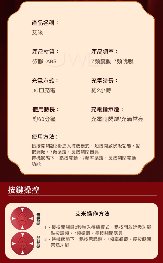 全新「升級」 舌吸入體雙重體驗,高潮一觸即發;CG 共震,内外高潮二重奏,讓高潮的 可能性,多了不止一點點!7頻吮吸,定位蜜豆包裹,每一頻吐吸滲透到身體深處;舌頭刺 激引爆熱流,感受洶湧的快意,爽!親膚細膩,軟糯不傷身;7頻震動,穿透級刺激,高頻 馬達釋放強勁動力,穿透皮膚,直達靈魂深處;全身防水,不懼濕身,在哪都能意亂情迷~