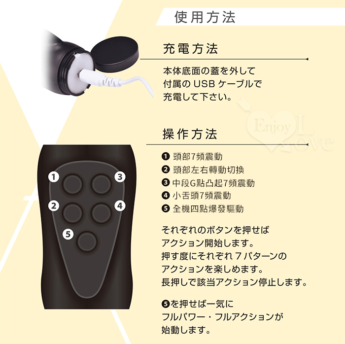 頭部配備渦輪馬達、G 位置配備高速微型馬達、副震動配備高扭矩馬達,可享受 3 種振動 + 擺動動作的快感產品。