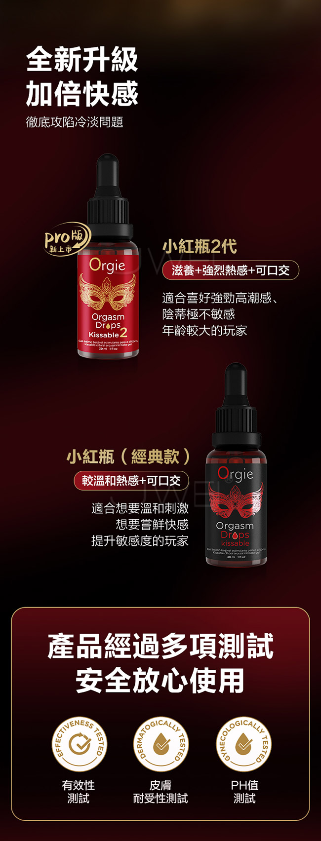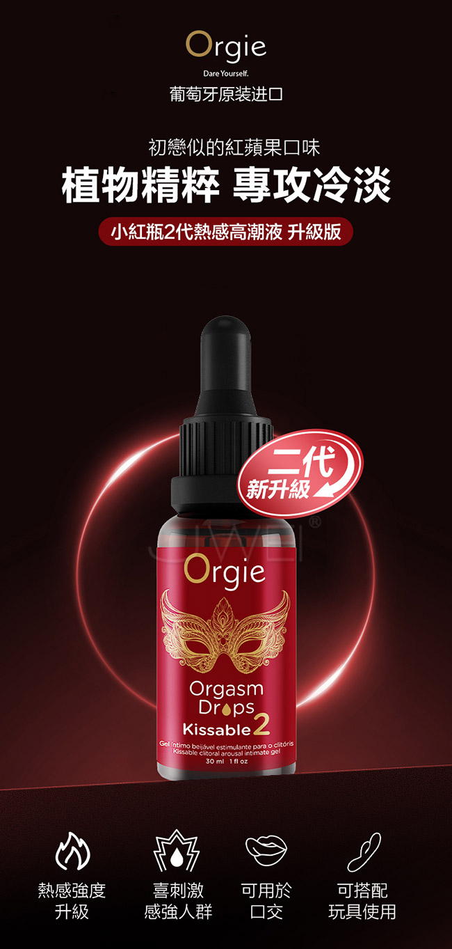 小紅瓶2代,滋養+強烈熱感+可口交,適合喜好強勁高潮感、陰蒂極 不敏感,年齡較大的玩家;起效快,快感無需等待,房事前塗抹在豆 豆,按摩幾秒即可;好清洗,無殘留更安心,遇水即溶愛後用,清水 沖洗即可;溫和養護,呵護嬌嫩私處,維生素E抑制體內性激素水準 的波動,增強新陳代謝到滋養修護的功效;激情性愛,從“口”開始 ,香甜紅蘋果口味,甜蜜口感加上溫熱的刺激,感受唇間和肌膚的激 情碰撞,,增加快感!