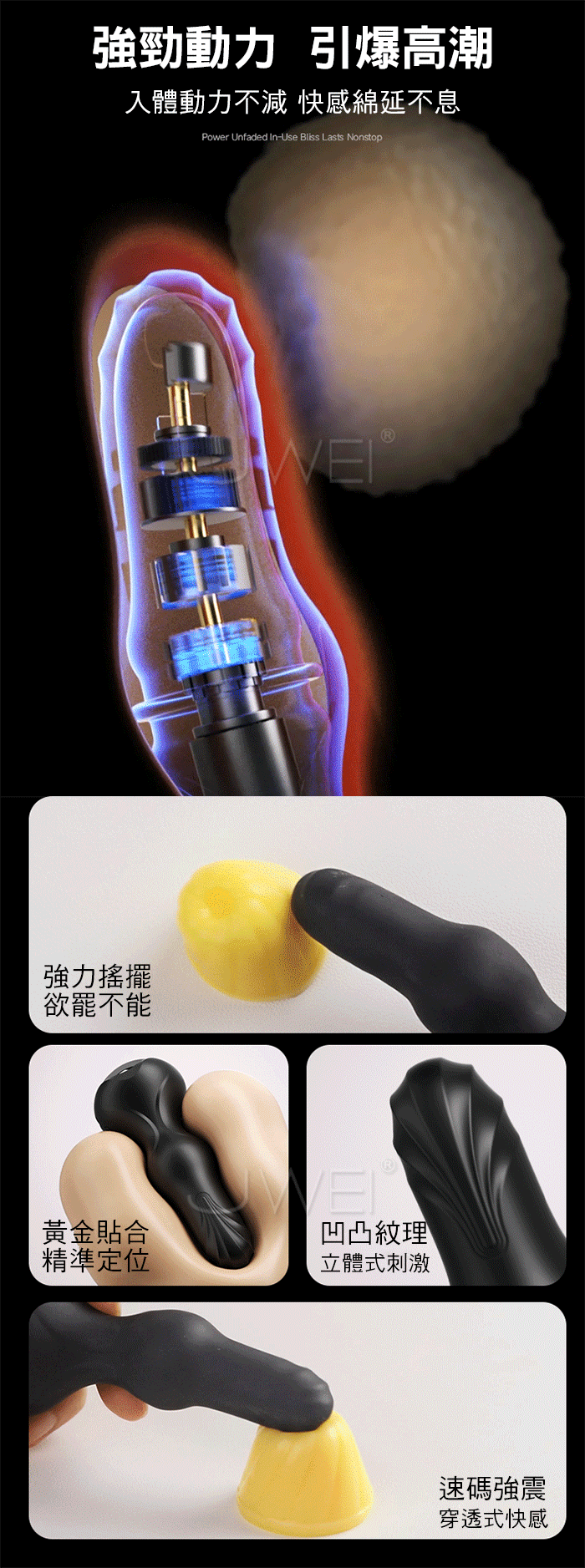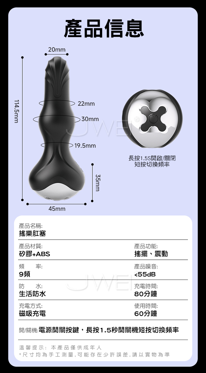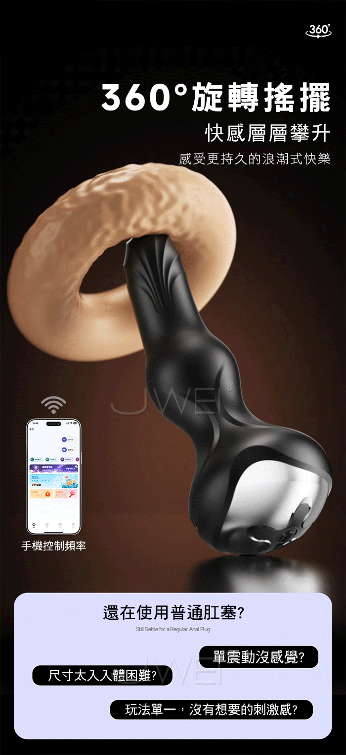 360度旋轉搖擺,快感層層攀升,感受更持久的浪潮式快樂 強勁動力 引爆高潮,入體動力不減 快感綿延不息 人體工學設計,新手友好舒適不撐大,尾部收緊防止滑出 ■尺寸:大小詳如圖片標示 ■材質:矽膠+ABS ■功能:9頻搖擺、APP智控